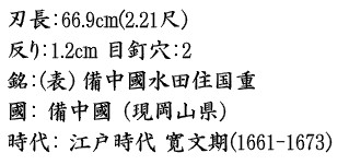 - Длина клинка (Hacho): 66.9 см (2.21 Shaku)